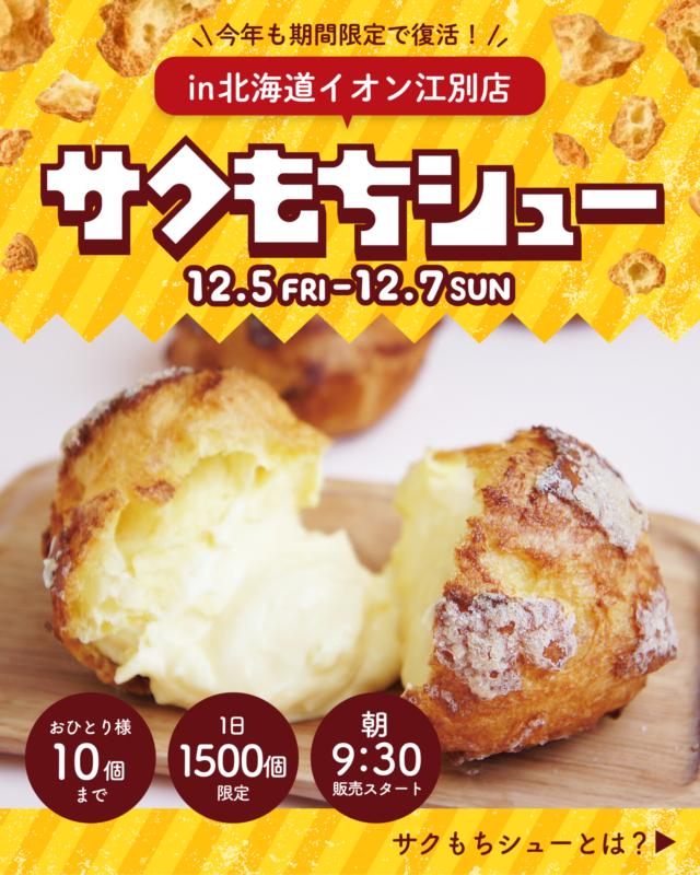 大人気商品・『サクもちシュー』が、お客様の声にお応えし、今年も北海道イオン江別店で期間限定復活🎉🎊